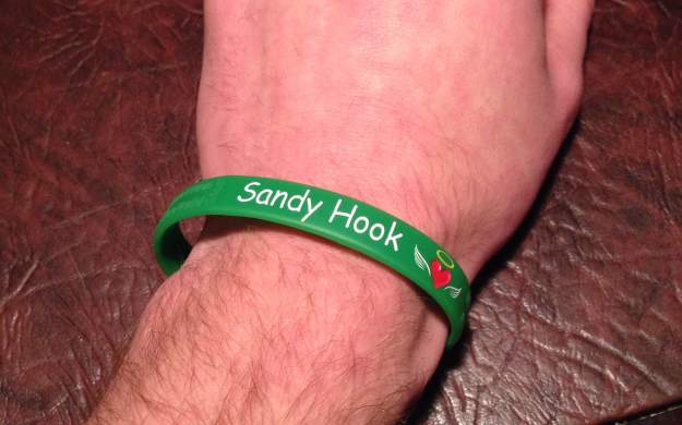 There is perhaps no better symbol for the modern age of slacktivism than the colored rubber bracelet. Pay a couple dollars and show your “support” for a cause. Mine is green, with Sandy Hook in white letters, a red heart with a halo and wings and on the inside it reads “With Love (the “o” is a heart) and Prayers from GoodsForGiving.com”. That’s all well and good but what struck me most are the 26 names in raised lettering: Olivia Ana Noah Benjamin Dylan Emilie Allison Caroline Madeleine Chase Avielle Josephine Lauren, and below: Jessica Victoria Grace Charlotte Mary Catherine James Jack Dawn Rachel Jesse Anne Marie Daniel, followed by 12.14.12. That’s powerful stuff and I didn’t even have to donate (read: pay) a dollar.